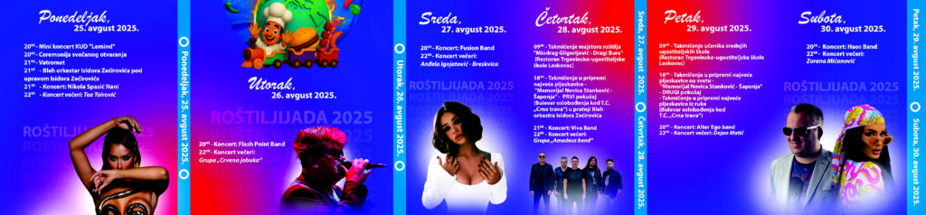 - Subota, 30. avgust – Veče posvećeno narodnoj muzici i takmičenje u pripremi leskovačke pljeskavice